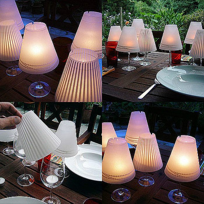 Свечи в высоких бокалах, украшенных аккуратными бумажными абажурами, станут оригинальным украшением праздничного стола.