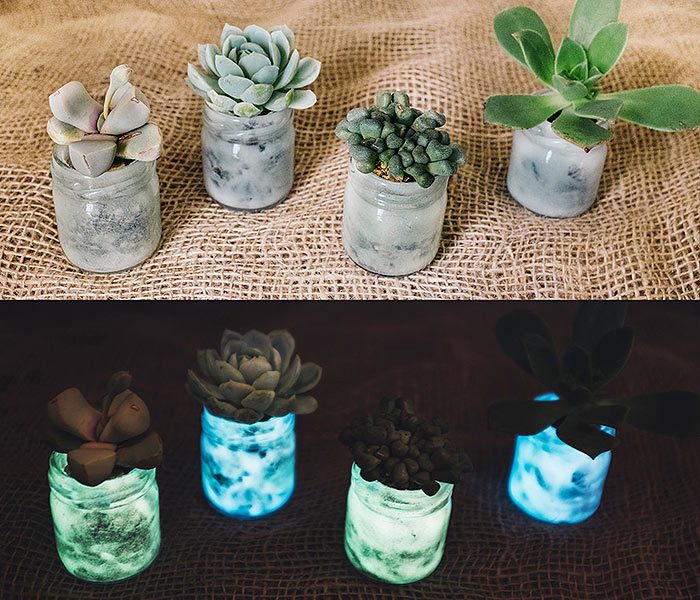 Обыкновенные стеклянные банки, покрашенные изнутри люминисцентной краской, заполненные светящимися камнями и украшенные суккулентами прекрасно подойдут для украшения стола, крыльца и двора.