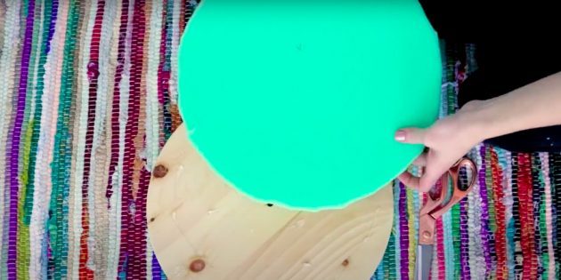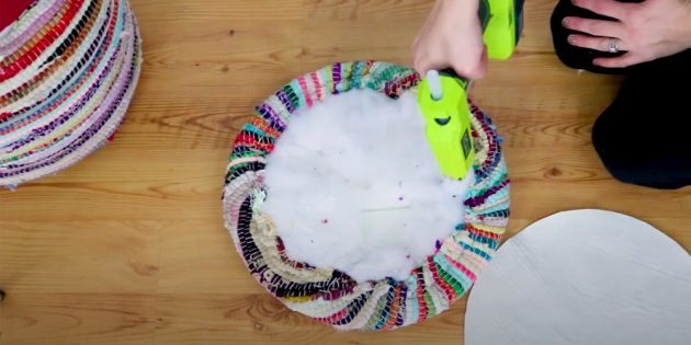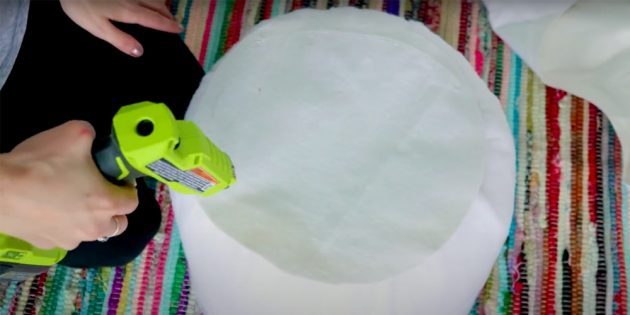 Вырезанный по размеру дна флисовый круг приклейте поверх завёрнутых краёв синтепона, чтобы нижняя часть пуфика выглядела аккуратно.
