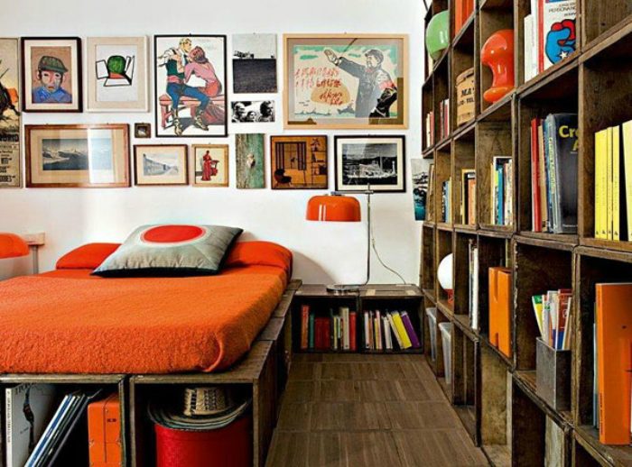 Стильная кровать с каркасом из деревянных ящиков — то, что нужно для оформления спальни в загородном доме.