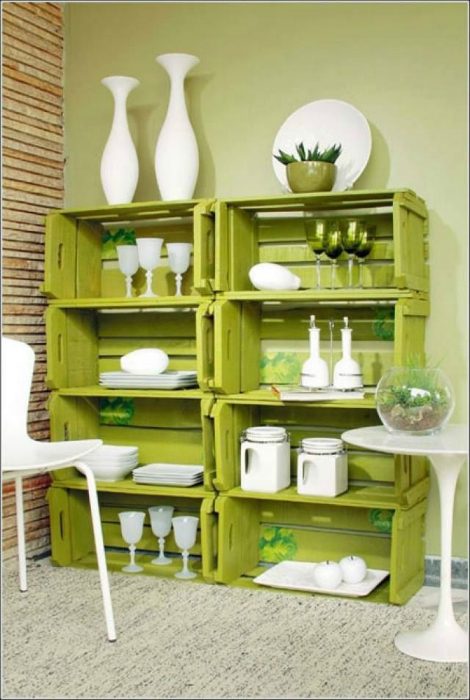Конструкция из нескольких покрашенных и скрепленных между собой ящиков прекрасно подойдут для хранения чайных сервизов и другой посуды. Главное, стоит позаботиться о надежности и устойчивости конструкции.
