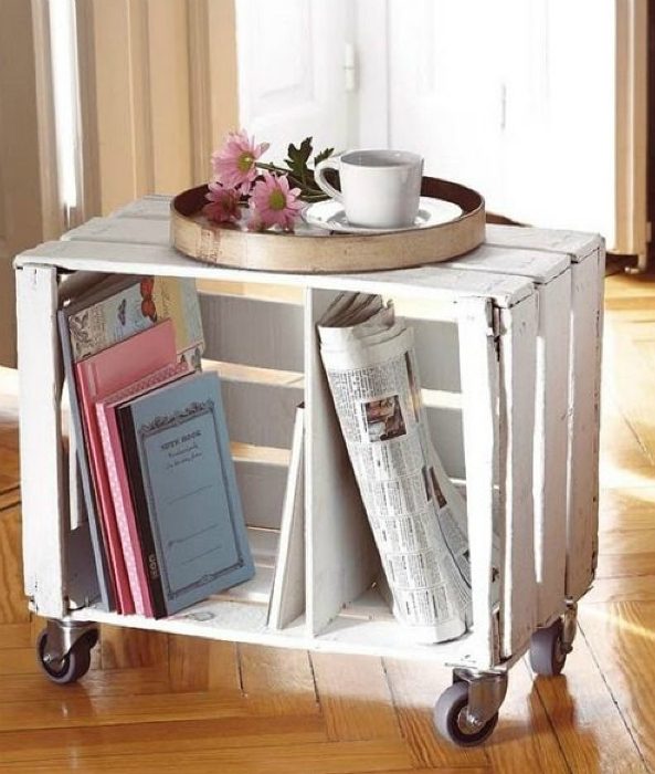 Очаровательный и очень функциональный столик на колесиках с местом для хранения различных мелочей, который под силу сделать каждому всего из одного деревянного ящика.