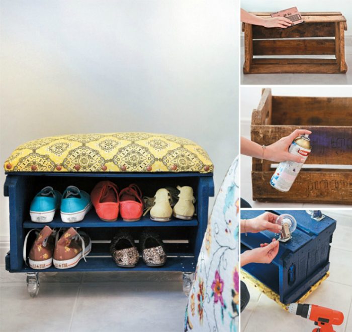 Люди, которые располагают большим количеством деревянных ящиков и не меньшим количеством обуви могут подумать о сооружении такого стильного стеллажа, который станет изюминкой квартиры или гардеробной.