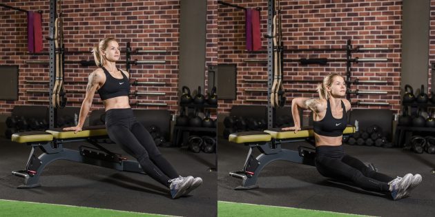 Возьмитесь за брусья, не поднимайте плечи, сведите лопатки. Опуститесь до параллели плеч с полом. Корпус держите прямо, не наклоняйтесь вперёд: это позволит максимально загрузить трицепсы. Выжмите себя наверх и повторите упражнение.