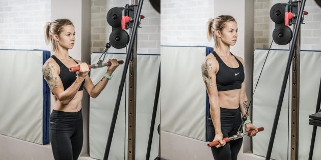 Повесьте на блок канатную рукоять, возьмитесь за оба её конца. Примите устойчивое положение, выпрямите спину, опустите плечи, локти держите близко к туловищу.
