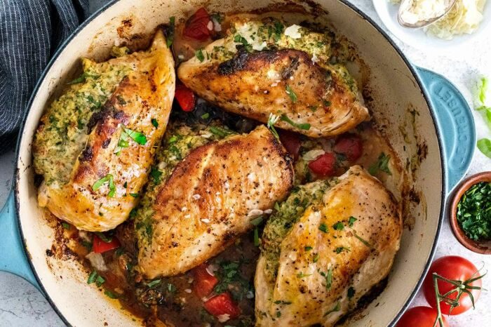 Фаршированное куриное филе, запечённое в духовке, одинаково хорошо как самостоятельное блюдо, так и с гарниром из белого риса, отварного картофеля или же лапши.