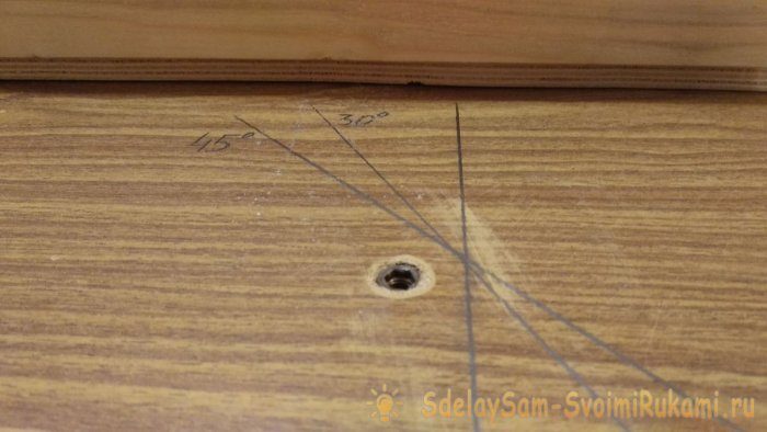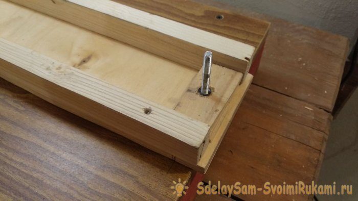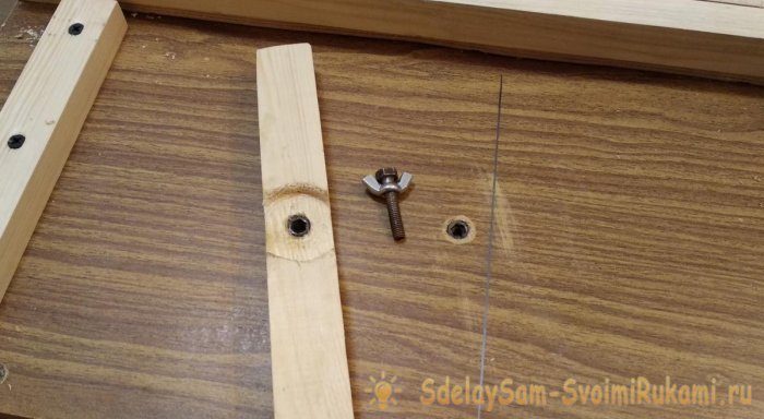 18. Для реза под произвольным углом (30, 45 градусов) устанавливаем второй упор, использую мебельные футерки и винт. Винт я изготовил, плотно накрутив на болт М6 барашковую гайку.