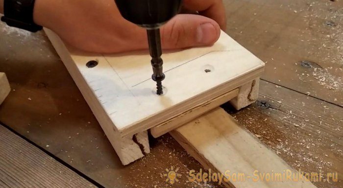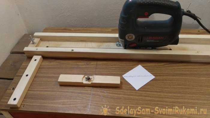 4. Далее изготавливаем направляющие из двух реек 20х30 мм и основания из фанеры 10 мм, а также ограничителей хода лобзика из рейки такого же сечения.