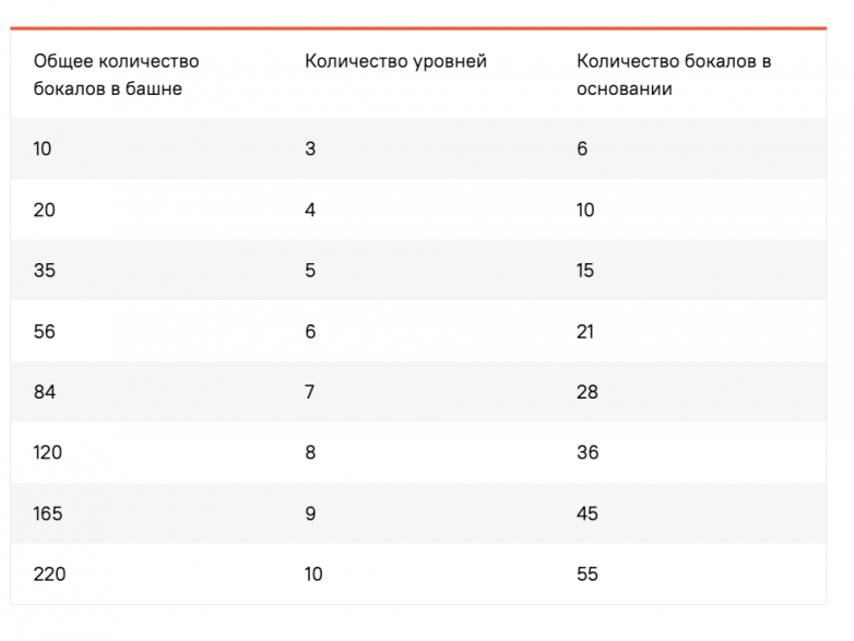 В башне с треугольным основанием наверху также будет один бокал, а затем три, шесть, десять, пятнадцать и так далее. Чтобы получить в основании треугольник из шести бокалов, поставьте в линию три бокала, потом перед ними ещё два, а в следующем ряду — один.