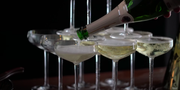 Если башня очень высокая, лучше частично заполнить нижние бокалы заранее, а верхние оставить пустыми. Гостям может просто надоесть наблюдать за наполнением 200 бокалов.