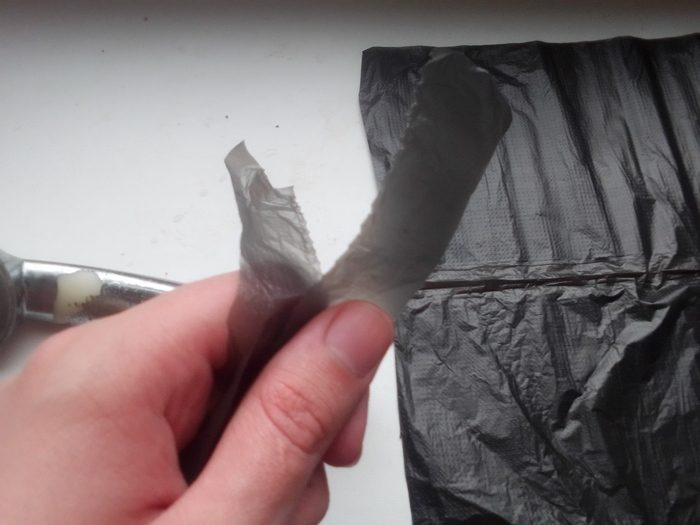 В качестве временного, но вполне надежного решения вопроса можно заменить ФУМ-ленту или паклю обычным полиэтиленом. Для работы помимо сантехнического инструмента понадобится какой-нибудь пакет из соответствующего материала и канцелярский нож (или обычные ножницы). Сначала снимаем мерку с трубы, крана или фитинга. Затем вырезаем из куска полиэтилена подходящую по размеру полосу и наматываем ее на резьбу. Далее делаем все то же самое, что и при работе с профильным материалом для изоляции – аккуратно собираем всю конструкцию.
