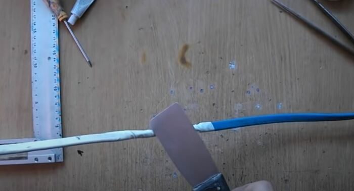 Одной только синей изоленты для решения вопроса подобного толка не хватит. Для работы также понадобится термоусадочная трубка и эпоксидная смола. В ряде случаев смолу можно заменить жидким клеем. Из инструментов понадобится строительный фен или источник открытого огня, нож, пассатижи. Как только все перечисленное будет подготовлено, можно будет браться за работу. Само по себе операция высоконадежной изоляции не хитрая, хотя и состоит из нескольких этапов.