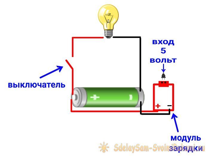Мой фонарик, работающий от зарядного устройства (которое так же исполняло роль рукоятки фонарика), оказался для такой работы не очень удобен – слишком уж у него узконаправленный луч, рассчитанный на дальние расстояния. А зума нет. Но никогда недолго быстренько спаять светильник с нужной направленностью света. Для этого понадобится небольшая светодиодная панель с диапазоном потребления от 3 до 6 вольт, аккумулятор 18650 на 3,7-4,2 вольт, выключатель, и модуль зарядки. Ну, а спаять все составляющие в нужном порядке, я думаю, сможет любой. На всякий случай вот схема: