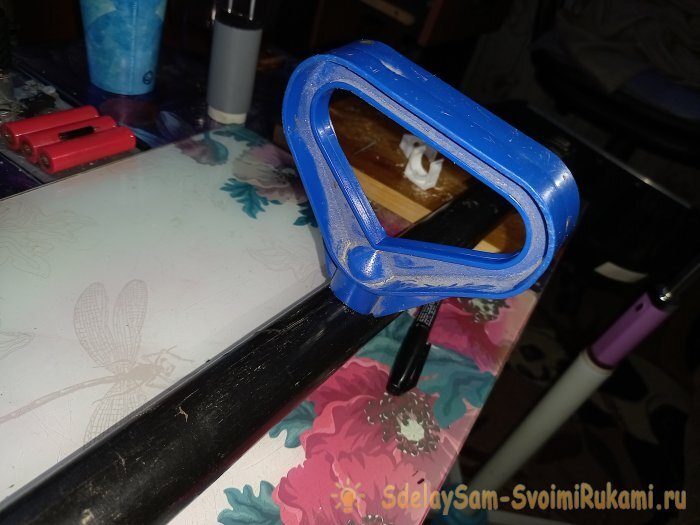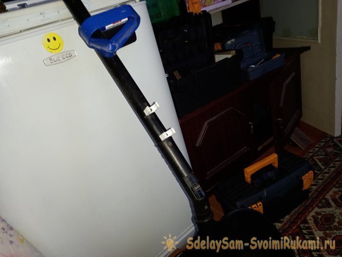 С такой конструкцией основная нагрузка приходится на трицепс, бицепс и пресс, оставляя минимальную нагрузку на поясницу. Теперь позаботимся о зрении. Точнее, об освещении в тёмное время суток. Тут всё проще некуда. Нужно просто вкрутить в черенок, сразу после отвода, пару клипс для водопроводных труб, на расстоянии в 6-8см друг от друга. Внутренний диаметр клипс должен соответствовать диаметру Вашего фонарика.