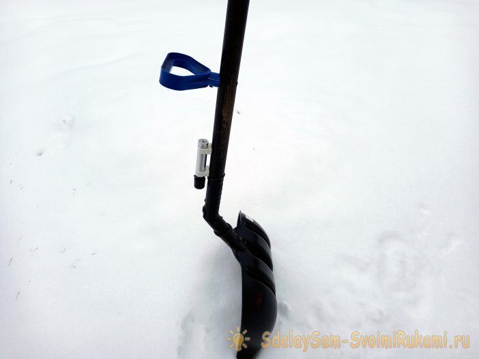 С таким углом наклона, захват снега в лопату гораздо больше, а нагрузка на плечи и спину уменьшается в разы. Ну, а чтобы уменьшить нагрузку ещё и на предплечья, мы приделаем к черенку ещё одну рукоятку. Одна рукоятка (если у Вас их на лопате вообще не было), устанавливается на окончание черенка и крепится саморезом.