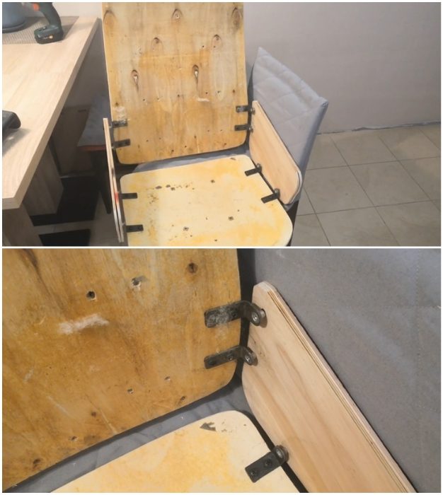 С помощью металлических уголков мастерица соединила все деревянные детали, получив на выходе каркас кресла. Когда угол уклона ширина и высота были определены, конструкцию пришлось разобрать, чтобы сделать обивку. Поролон (не менее 10 см) и синтепон оказались в наличии, их осталось только закрепить. Это можно сделать с помощью клеевого пистолета.