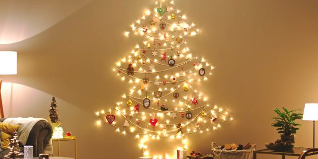 Чтобы сформировать ёлочку, повесьте гирлянду зигзагом. На стене можно украсить её шариками или мишурой.