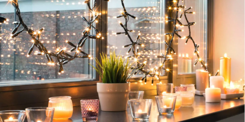 Для окон подойдёт и обычный, хотя он может оставить липкий слой, который будет трудно счистить. А если гирлянда тяжёлая, скотч может не выдержать и отклеиться.
