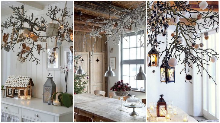 Изящное новогоднее украшение можно сделать из обычной ветки. Покрасьте ее серебряной краской из баллончика и прикрепите к люстре или карнизу. Теперь повесьте на ветку елочные игрушки — сказочная атмосфера гарантирована.
