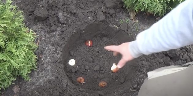 Глубина посадки должна быть втрое больше высоты луковицы. Можно выкапывать как отдельные лунки для каждого тюльпана, так и траншеи — прямые или образующие определённый узор на клумбе. В любом случае, дистанция между луковицами должна быть не меньше 5 см.