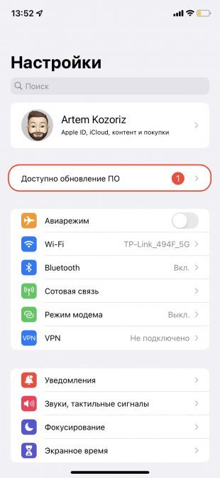 Зайдите в «Настройки» и тапните по пункту «Доступно обновление ПО» или откройте раздел «Основные» → «Обновление ПО».