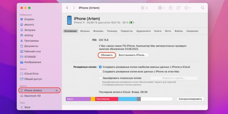 Выберите в боковой панели свой iPhone и кликните «Обновить».