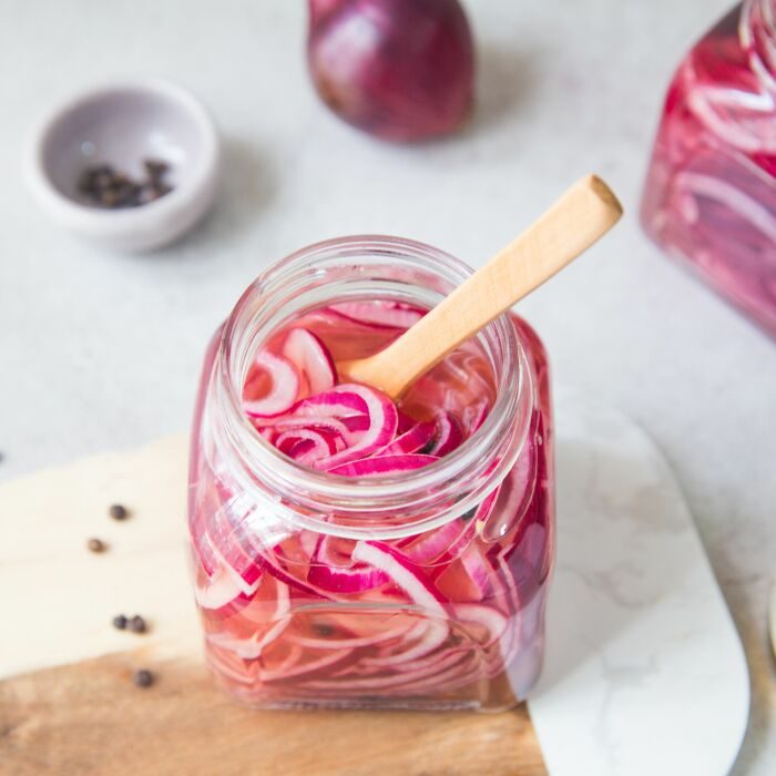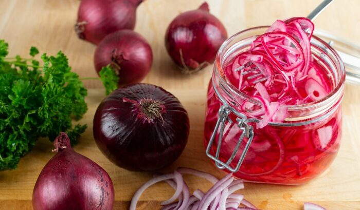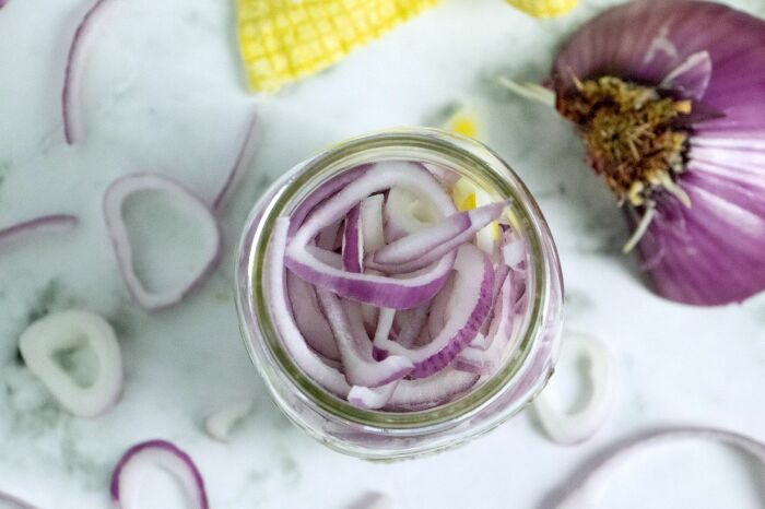 Среди самых простых вариантов маринада – с традиционным уксусом, который отлично сочетается с любыми видами лука, что можно найти под рукой.