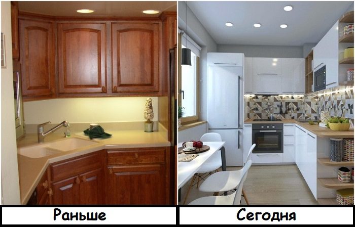 В 80-90-х годах прошлого века фасады «под дерево» были невероятно актуальны и присутствовали во всех квартирах, хозяева которых могли себе позволить идти в ногу с модой. Однако сейчас подобное интерьерное решение считается устаревшим. Сейчас в тренде однотонные шкафы нейтральных цветов, предпочтительнее серого или белого. Поэтому если хотите сделать кухню более современной, покрасьте яркие фасады в светлый оттенок – этот вариант подойдет в том случае, если имеющийся гарнитур устраивает вас по функциональности. В противном случае купите новую кухню, соответствующую модным тенденциям.