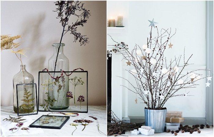 Если вы часто гуляете в парке или рядом с вашим домом есть лес, соберите там элементы для будущей декоративной композиции. Пригодится все: ветки, шишки, сухоцветы, листья, мох и пр. Из тонких прутиков можно сделать декоративный венок, ветки поставить в вазу и украсить гирляндами, а палочками оформить горшки для растений. А еще можно вспомнить уроки труда в школе и сделать гербарий из засушенных листьев и цветов.