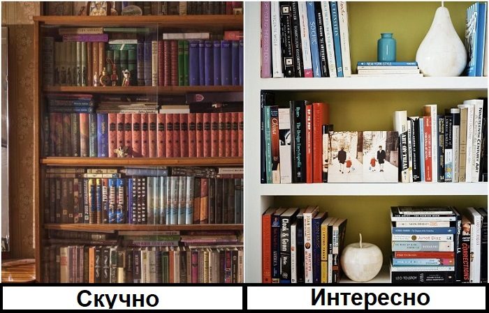 Если говорить о классической расстановке книг, то на ум сразу приходит вертикальная. Однако кто сказал, что нужно четко следовать этим канонам? Предлагаем взглянуть на букинистику под другим углом и немного поэкспериментировать. Например, можно чередовать горизонтально и вертикально расставленные книги, расставлять литературу корешком назад или сортировать по цветам. При взгляде на полку должно создаваться ощущение небрежности. Если в ходе ревизии книжного шкафа вы обнаружили ненужные экземпляры, сделайте из них оригинальный прикроватный столик или подставку для цветов. Красивые обложки могут найти свое место в виде постеров в фоторамках или в качестве кашпо для суккулентов.