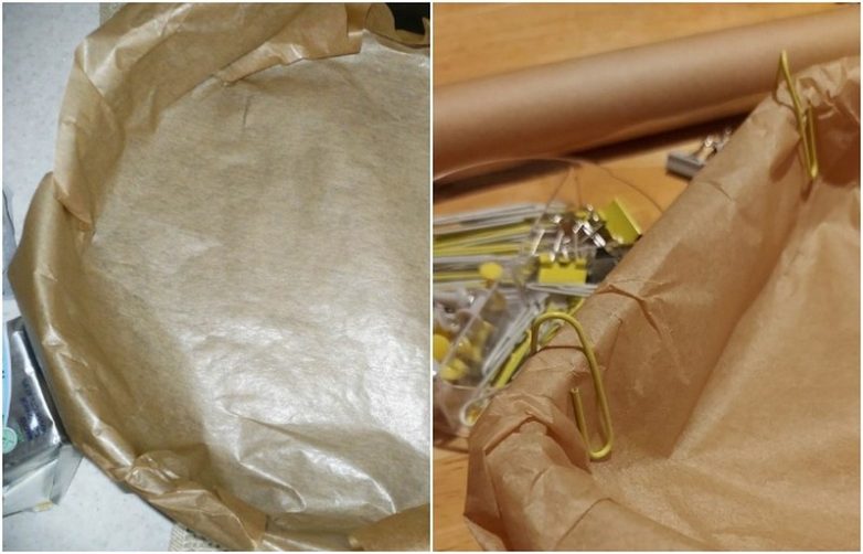Пироги, печенье, булочки и прочую выпечку в большинстве случаев рекомендуют готовить на противне или в форме, застеленной пергаментной бумагой. Это нужно для того, чтобы тесто не прилипало ко дну. Однако есть здесь один нюанс: пергамент очень сложно уложить таким образом, чтобы он сидел ровно. Какой есть выход из данной ситуации? Банальные скрепки или зажимы для бумаги. С их помощью получится без проблем зафиксировать пергамент. Конечно, можно по старинке смять его, но тогда вряд ли получится равномерно распределить тесто. После того, как вы заполните форму, можете убрать скрепки или зажимы – они свою работу выполнили.