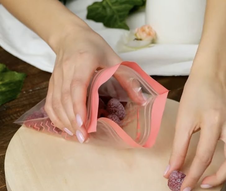 Если сначала заморозить свежие ягоды на тарелке, разместив их на некотором расстоянии друг от друга, а уже потом убрать в пакет, то они не слипнутся в морозилке