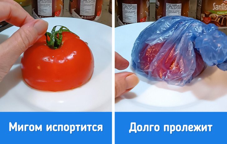 Надо всего лишь положить помидор в пакет, так чтобы пластик плотно прижимался к срезу и свободно охватывал остальную часть плода. В таком виде помидор кладут срезом вниз на тарелку и отправляют в холодильник. В этой упаковке плод может храниться несколько дней.