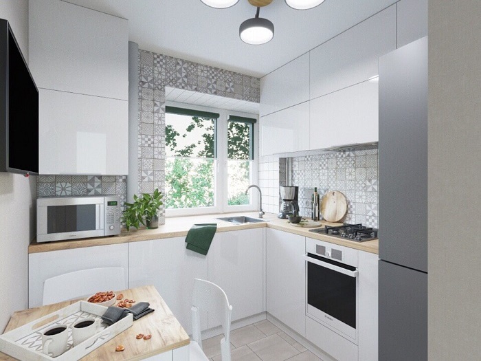 Заставлять подоконник на маленькой кухне комнатными цветами – это настоящее преступление. Намного практичнее использовать его в качестве стойки для завтраков или объединить с кухонной столешницей, чтобы увеличить рабочую зону. Также в подоконник можно встроить раковину и во время мытья посуды наслаждаться видом из окна (если он красивый). Последний вариант хорош еще и тем, что можно будет экономить электричество, используя дневной свет. На худой конец можно просто использовать эту зоны в качестве открытой полки для посуды, мелкой бытовой техники, емкостей для хранения сыпучих и так далее.