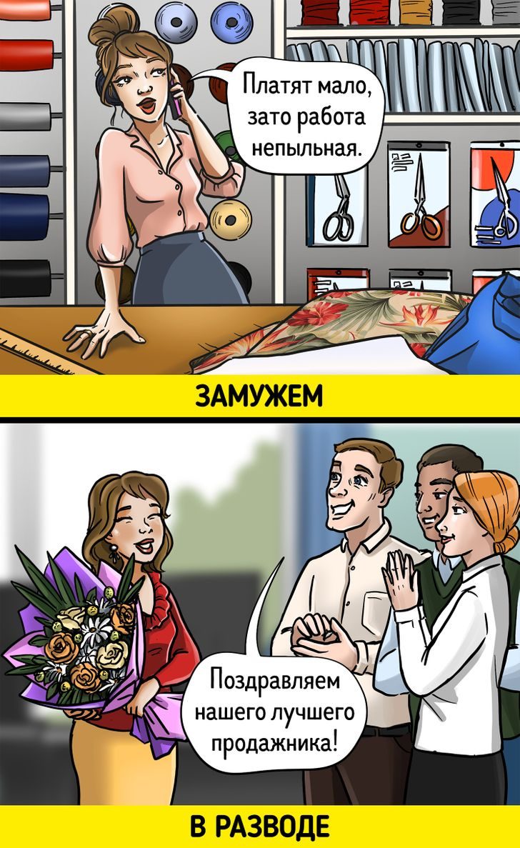 Если в европейских странах со стабильной экономикой доход разведенных женщин падает, то в странах с традиционным патриархальным укладом — растет. Исследовательница Лилия Родионова объясняет это тем, что быт и дети по старинке ложатся на плечи жены. Она ищет работу с гибким графиком, но и менее денежную. Ну а после развода дети обычно остаются с матерью, и женщине приходится искать более высокооплачиваемую работу.