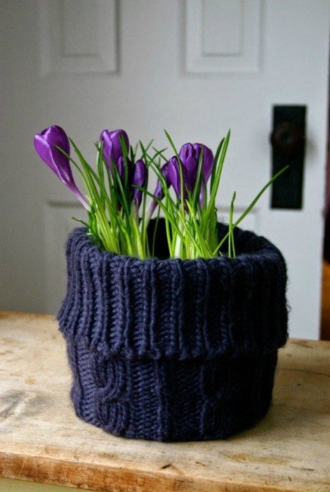 Обычные цветочные горшки можно украсить, надев на них очаровательные чехлы, связанные своими руками из имеющихся остатков пряжи.