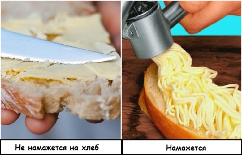 Если вы предпочитаете завтракать бутербродами со сливочным маслом, то прекрасно знаете, как сложно намазать на хлеб подмороженный кусочек, ведь он нещадно крошится. Есть два варианта: подождать, пока масло разморозится и станет более податливым или отрезать небольшой кубик и прогнать его через пресс для чеснока. Масло будет более мягким, эластичным и без проблем намажется на хлеб.
