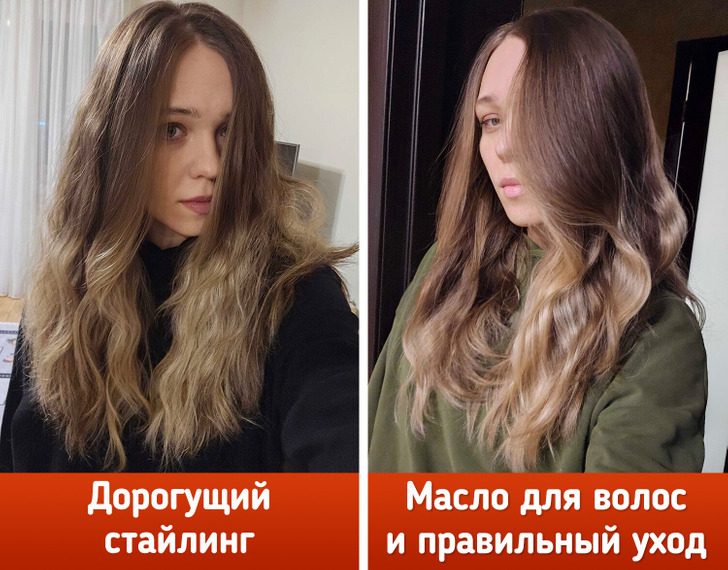 На втором фото она вымыла голову прохладной водой и подсушила феном только корни. Основная длина высохла естественным путем. На концы нанесла немного масла. Волосы стали как после салона — блестящие и шелковистые.