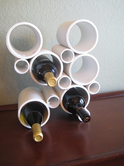 Удачное решение создать подставку из ПВХ труб для хранения вина.