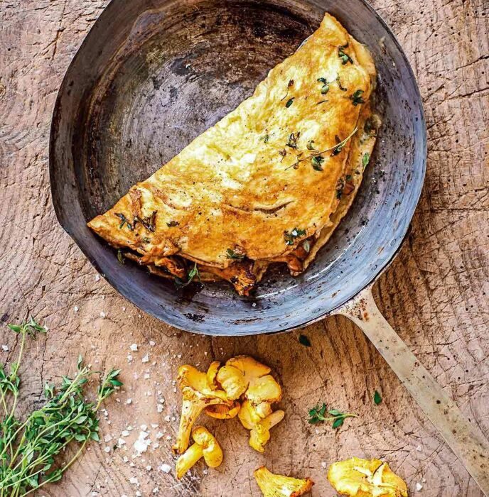 Помимо шампиньонов, с таким блюдом хорошо сочетаются нежные лесные лисички. Их мягковатый привкус перевернёт ваше представление об омлете с ног на голову.