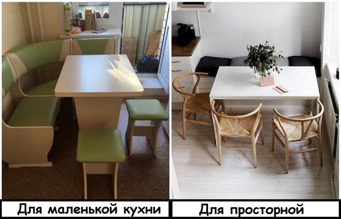 Мы считаем так – нужно отталкиваться от габаритов кухни и учитывать количество людей, проживающих в квартире. Если комната позволяет установить полноценный стол и несколько стандартных стульев – отлично. Также можно разместить мини-диван, оборудовать обеденную зону скамьей с подушками или выбрать мягкие стулья-кресла. Если же помещение совсем крохотное и есть свободный угол – поставьте кухонный уголок, но только выберете вариант, подходящий по цвет и стилю интерьера, чтобы он не казался инородным элементом.