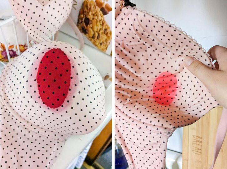 Попробуйте замочить бюстгальтер в белом уксусе, потом отпарьте его и постирайте с содой. Кроме того, не советую тереть пятно, лучше промокайте с помощью бумажных полотенец. Иначе оно только расползется. © xandrsreddit