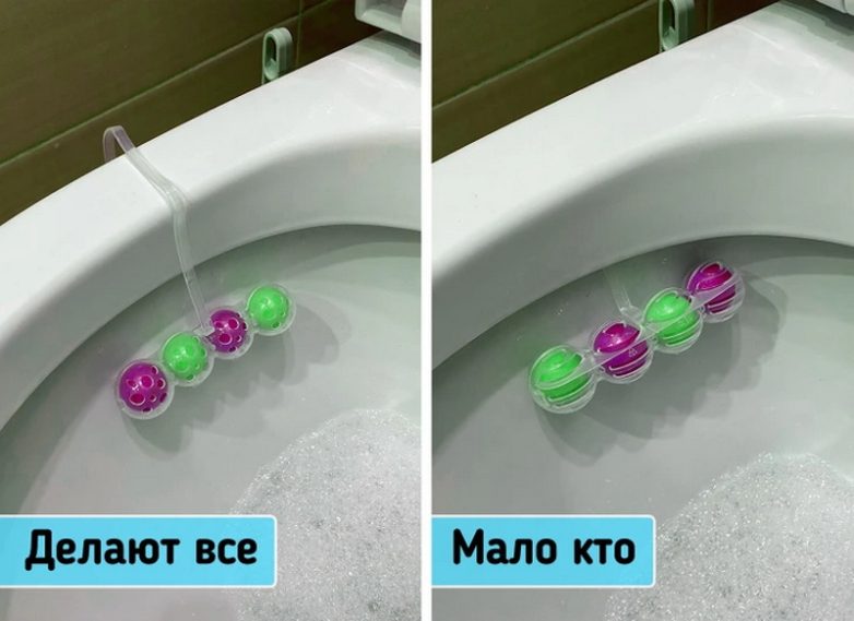 Многие по привычке крепят специальные чистящие шарики на ободок унитаза. Однако это не очень удобно, и есть еще одни правильный способ крепления. Гигиенический блок можно вставить в выемку под ободком. Так он будет плотно зажат сиденьем унитаза и не принесет дискомфорта.