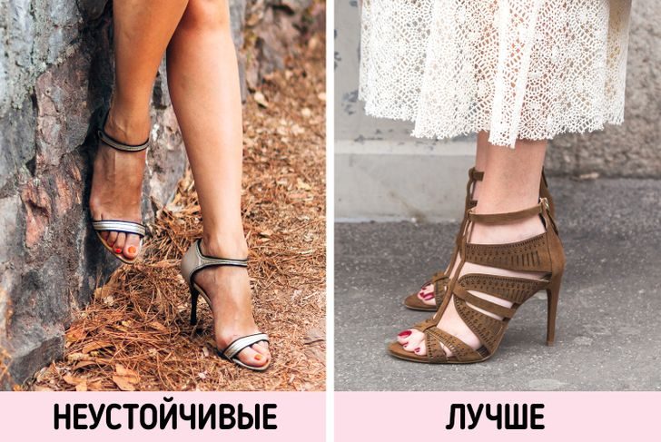 Речь совсем не о пуританских нравах. Верхняя часть некоторых босоножек состоит всего из нескольких ремешков. Малое количество материала уже не так крепко фиксирует стопу в туфле. Из-за этого обувь теряет устойчивость. При длительном ношении ваши ножки могут быстрее уставать.