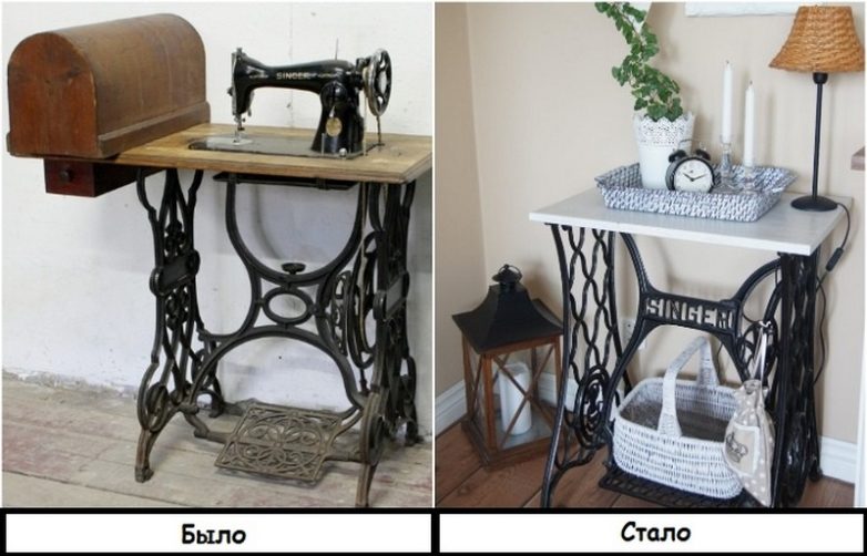 Если у вас сохранилась старая швейная машинка со столом, но вы не используете ее по назначению, оставлять предмет в интерьере целиком непрактично, ведь он занимает очень много места. Предлагаем отличный альтернативный вариант – сохраните только красивое подстолье и кованые ножки. Зачем? Их можно дополнить столешницей и использовать в качестве консоли, туалетного столика или тумбы. При необходимости покрасьте новый предмет мебели в другой цвет – более яркий или, наоборот, нейтральный. А еще чугунное основание от машинки можно покрыть специальным составом от ржавчины и использовать в качестве столика под раковину.