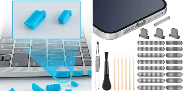 С заглушками ноутбук и смартфон придётся чистить от грязи гораздо реже. Обычно они продаются наборами, заглушки из которых помогут прикрыть от пыли все имеющиеся на устройстве разъёмы.