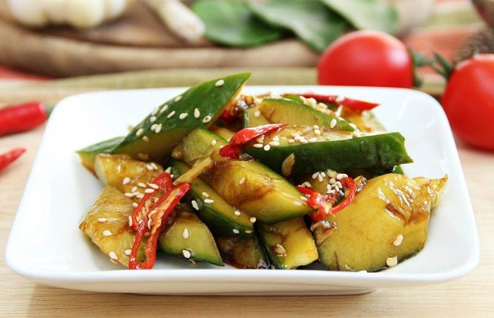 Это блюдо считается изысканным и дорогим, однако по факту, его с легкостью может приготовить каждая хозяйка, хоть немного знакомая с правилами консервации. Китайская закуска представляет собой огурцы, замаринованные в смеси уксуса, соевого соуса и кунжутного масла с добавлением чеснока. И не нужно вестись на название – на самом деле огурцы никто не бьет. Просто перед маринованием овощи отбиваются плоской стороной ножа, чтобы они быстрее пропитались маринадом.