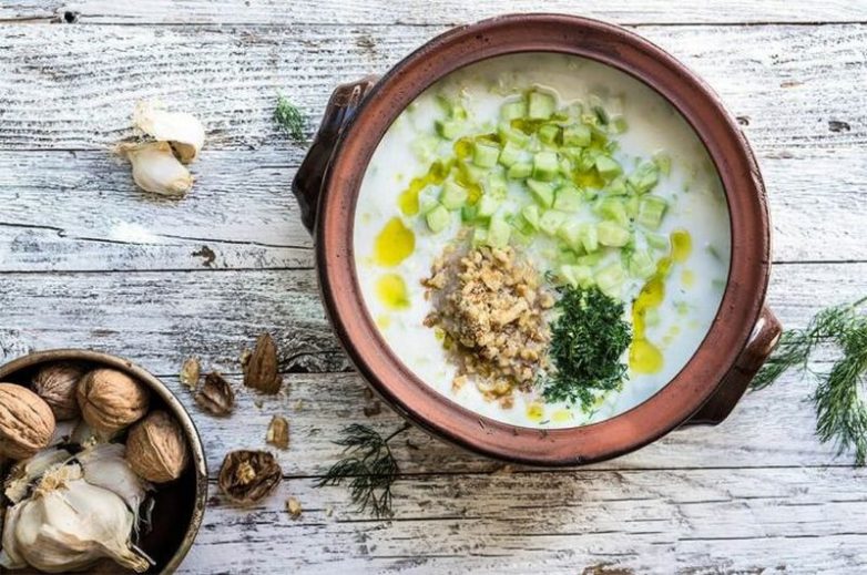 • Украсить мелко нарезанным укропом и измельчённой мятой;