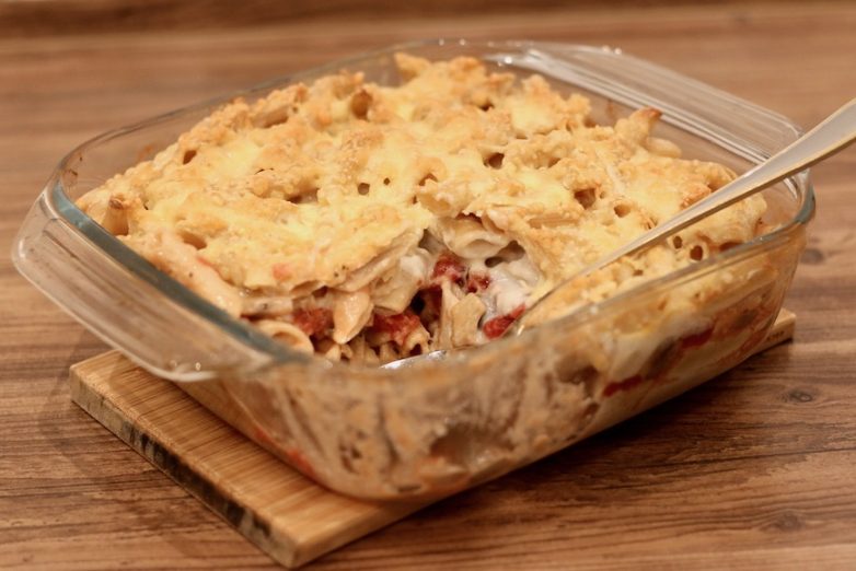 Заправить макароны соусом бешамель. Половину выложить в форму для выпечки. Затем выложить грибную начинку и накрыть оставшимися макаронами. Посыпать сыром и печь 15–20 минут при температуре 200 градусов.