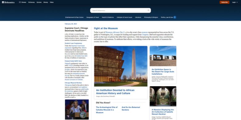 Очень часто именно «Британскую энциклопедию» используют как справочник во время исследований и написания различных текстов. Материалы созданы уважаемыми авторами с подтверждённым уровнем экспертности. Кроме подробных статей здесь можно найти краткие резюме, а также подкасты, инфографику и викторины.